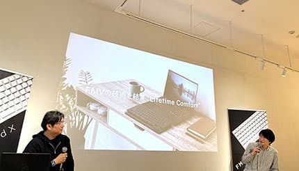 スペシャル対談では、「Lifetime Comfort」のコンセプトや「FMV Keyboard X」特徴について、FMVキーボードマイスターの藤川氏と矢崎氏が改めてトークを展開。矢崎氏は「FMV Keyboard X」の開発には関わっていないが、以前にクラウドファンディングを実施して製品化された「LIFEBOOK UH Keyboard」に関わっていたため、今回のイベントに召集されたという。