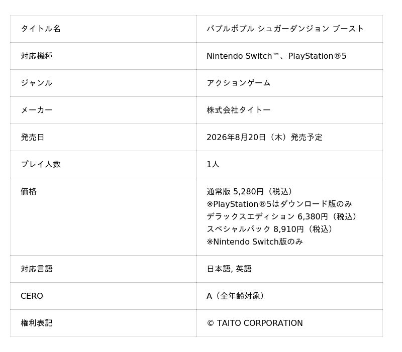 株式会社タイトー(本社:東京都新宿区、以下タイトー)は、今年で40周年を迎える『バブルボブル』シリーズ最新作のアクションゲーム『バブルボブル シュガーダンジョン ブースト』を、Nintendo Switch(TM)/PlayStation(R)5用ソフトとして2026年8月20日(木)に発売することをお知らせします。Nintendo Switch用ソフトについては、通常版パッケージ(税込5,280円)と、オリジナルサウンドトラックとアートブックがセットになったスペシャルパック(税込8,910円)も発売し、本日より予約開始します。