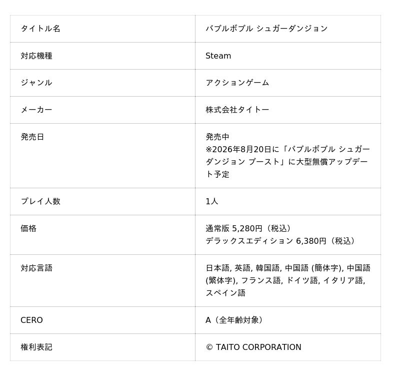 『バブルボブル シュガーダンジョン ブースト』公式サイト:https://www.taito.co.jp/BBSD『バブルボブル』シリーズポータル:https://www.taito.co.jp/bub