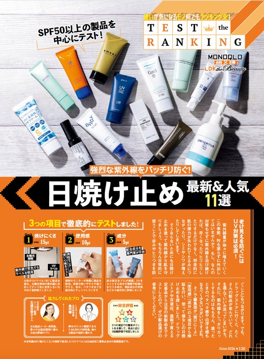 紫外線をしっかりカットするものはもちろん、塗ったときのベタベタ感や白浮き感もなるべく少ない方がいいですよね。そこで編集部が「焼けにくさ」「使用感」「成分」の3項目から検証を行い、使って損なしの日焼け止めを探しました。