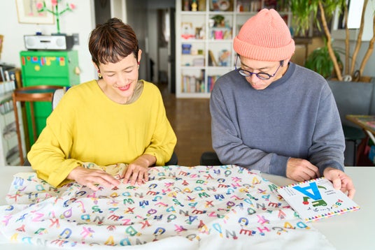 4/15に発売予定の中川政七商店の『ABCパーティ』の「かや織りふきん」を色校正する2人。 撮影/藤本直也