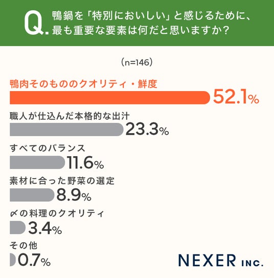株式会社NEXER・鴨鍋の"素材・〆"へのこだわりと満足度に関する調査