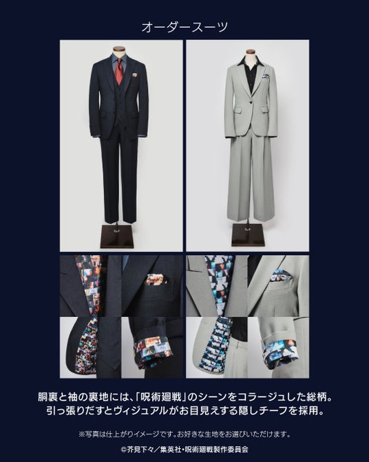 さらに、アニメ『呪術廻戦』の印象的なシーンをコラージュした総柄の限定生地も! 虎杖悠仁、七海建人、五条悟の3種類から選ぶことができ、スーツ&シャツでは裏地、スリーピースのベストでは背中側(背裏)に使用されます。