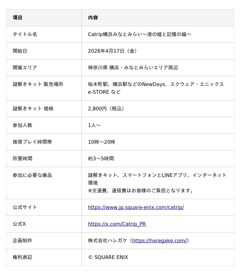 キリフダ株式会社(本社: 東京都中央区 代表取締役社長: 赤川英之)は、弊社で開発支援を行う株式会社スクウェア・エニックス(本社:東京都新宿区、代表取締役社長:桐生 隆司)の観光周遊型イマーシブミステリーウォーク『Catrip横浜みなとみらい~港の嘘と記憶の錨~』が、2026年4月17日(金)より提供開始となることをお知らせいたします。本作は、参加者が「謎解きキット」とスマートフォンアプリ「LINE」を用いて、横浜みなとみらいエリアを実際に歩きながら物語を体験する周遊型の謎解きゲームです。キリフダは、本作の体験を支えるシステム開発を支援しています。
