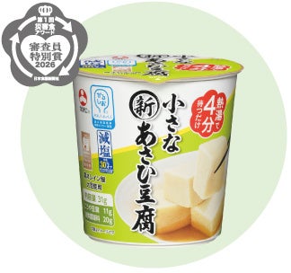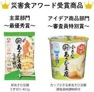 旭松食品株式会社(本社:大阪市、本店:長野県飯田市、代表取締役社長:木下博隆)は、高野豆腐「新あさひ豆腐」シリーズの『新あさひ豆腐 うす切り49.5g』および『カップ小さな新あさひ豆腐 減塩液体調味料付』が、日本食糧新聞社主催「第1回 災害食アワード2026」において、主菜部門 最優秀賞、アイデア商品部門 審査員特別賞のダブル受賞をいたしました。