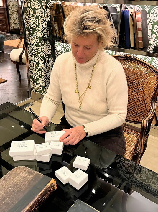期間限定のギフトボックスにサインを施すメゾンのアーティスティック・ディレクター、ローレ=イザベル・メレリオ。