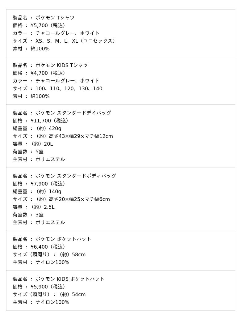 今回ご紹介するアイテムは、ピカチュウの刺繍が施されたTシャツ、リュックサック、ショルダーバッグ、ハットの4種です。