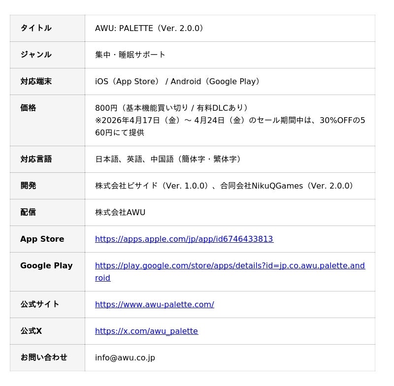 株式会社アドウェイズ(本社:東京都新宿区、代表取締役社長:山田 翔、以下アドウェイズ)の連結子会社である株式会社AWU(本社:東京都新宿区、代表取締役社長:西岡 明彦、以下AWU)は、VTuberと過ごす集中・睡眠サポートアプリ「AWU: PALETTE」の大型アップデートVer. 2.0.0を、App StoreおよびGoogle Playにて、2026年4月17日(金)に配信開始いたしました。