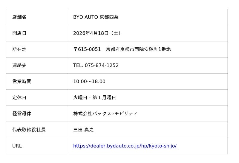 株式会社オートバックスセブン(代表取締役 社長:堀井勇吾)の連結子会社(孫会社)である株式会社バックスeモビリティ(代表取締役社長:三田真之)は、BYD Auto Japan株式会社の正規ディーラーとして、「BYD AUTO 京都四条」を、カーライフ&カルチャーストア「A PIT AUTOBACS KYOTO SHIJO(以下、A PITオートバックス京都四条)」内に2026年4月18日(土)に新規オープンいたします。