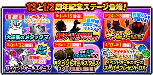 ステージクリアでにゃんこチケットがゲットできる「大逆襲のメタックマ」や、攻略に役立つアイテムがランダムでゲットできる「イベントオールスターズ スーパープレゼントDX」を開催いたします。