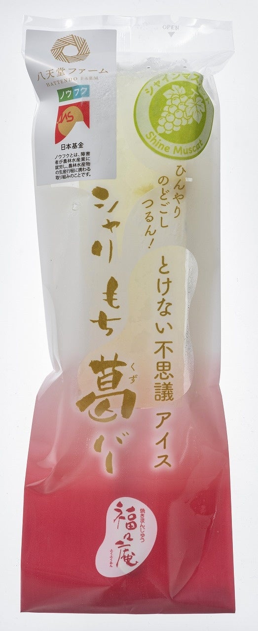 「シャリもち葛バー」は、福々庵の主力商品で和菓子の「葛粉」を使った、半解凍で食べる溶けない新食感が人気のアイスです。この度の『シャリもち葛バー(シャインマスカット)』は、八天堂ファームが社会福祉法人宗越福祉会と竹原市にある八天堂ぶどう園にて、農福連携で栽培したシャインマスカットのジャムを使用しています。
