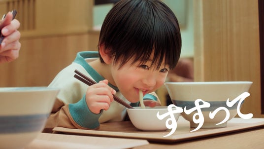 2.「杵屋締め食す編」では、ゆがきたてのうどんを子供から大人までが夢中で“すすり”“飲干す”様子をそれぞれ「大阪締め」の軽快なテンポで表現しました。