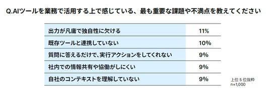 一方、ツールを活用する上で、最も重要な課題や不満点として挙げられているのは「出力が凡庸で独自性に欠ける」ことです。「出力が凡庸で独自性に欠ける」という不満から、単なる汎用的なアウトプットではなく、自社独自の内容や既存ツールとの連携を求めていることがわかります。より自社の業務や状況といったコンテキストを含んだ出力が期待されているようです。