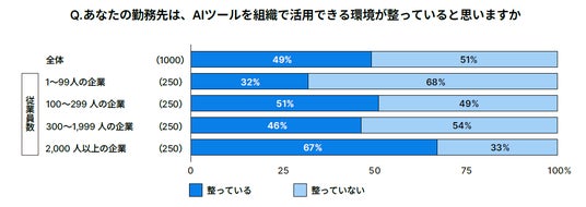 - 組織のAI活用環境については「整っている」49%、「整っていない」51%と真っ二つに分かれており、企業規模による格差が顕著。