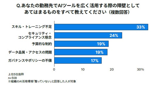 - 最大の障壁は「スキル・トレーニング不足」(33%)という回答が最も多く、利用許可だけでは活用が進まない構造がある。