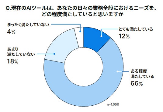 現状のAIツールについて、「ある程度満足している」(66%)が大多数を占めており、「とても満足している」という回答はわずか12%にとどまっています。この結果が示すのは、「不満はないが、飛び抜けた満足もない」という現状です。AIツールは日常業務を支える壁打ち相手として機能していますが、実務のパートナーといった期待を大きく超える体験を提供するには至っていません。