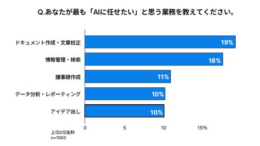 - 「AIに任せたい」最も任せたいと思う業務として挙げられているのは、ドキュメント作成・文章校正:19%、情報管理・検索:18%、議事録作成:11%となっている。