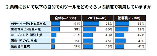 AIツールの利用頻度について64%が週1日以上利用、20%以上が毎日利用しているという結果は、AIがすでに多くのナレッジワーカーにとって日常的なツールとなっていることを示しました。用途別で見ると、週に1回以上の利用率は、文章生成・チャットボット(41%)が最も高く、次いで生産性向上・調査支援(38%)、コーディング・開発支援(23%)と続きます。全ての用途において、20代と管理職は他の世代や非管理職に比べて、より高頻度で多岐にわたる業務に活用している傾向が見られました。