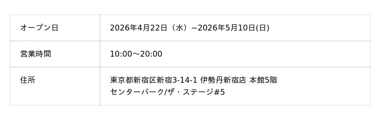 4月20日(月)より、POPUP STOREが続々オープンいたします。実際にTENTIAL製品を手に取り素材の質感や着心地をお確かめいただける特別な機会です。是非この機会に、お近くの店舗にてTENTIAL製品をご体験ください。※以下記載の店舗の場合、「母の日父の日限定 BAKUNE パジャマ スムース」の取り扱いはTENTIAL 伊勢丹新宿店 26SSプロモーションのみとなります。