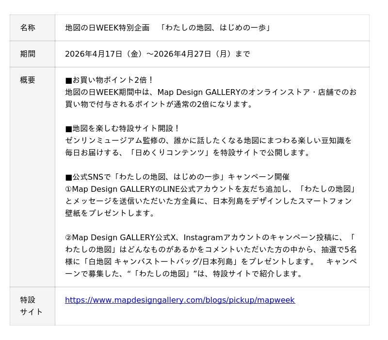 株式会社ゼンリン(本社:福岡県北九州市、代表取締役社長:竹川道郎、以下ゼンリン)は、地図がデザインされた文具や雑貨を販売するブランド「Map Design GALLERY」より、日本列島の白地図をベースに自分色の地図にアレンジできる新商品「白地図キャンバストートバッグ/日本列島」と「白地図 キャンバスミニポーチ」を、Map Design GALLERYオンラインストアにて2026年4月17日(金)より、各店舗にて2026年4月19日(日)より販売開始します。また、『地図の日※』を記念し、期間限定コンテンツの公開や新商品が当たるキャンペーンなど、地図の日WEEK特別企画を実施します。