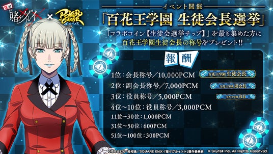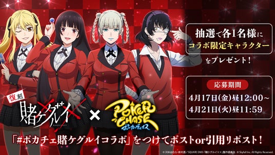 応募していただいた方の中から抽選で各1名様(計4名様)に「賭ケグルイ××」コラボキャラクターの『ポーカーチェイス』内プレイアブルキャラをプレゼントします。