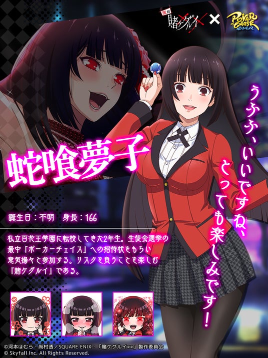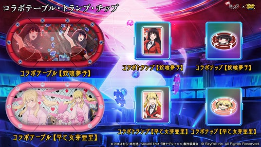 株式会社Skyfall(東京都港区 代表取締役社長:長谷川 智一、以下Skyfall)が運営するバトロワ式テキサスホールデムポーカーゲーム『ポーカーチェイス』は、TVアニメ「賭ケグルイ××」と、2026年4月22日(水)~ 5月13日(水)の期間限定でコラボイベントを復刻開催することが決定しました。