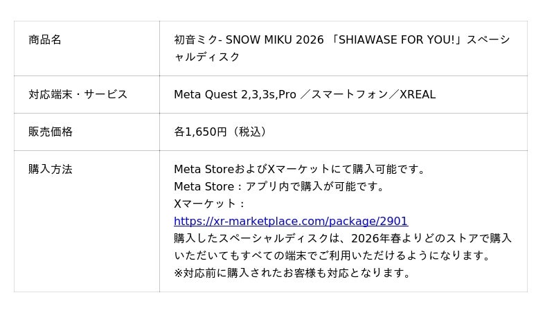 本作はSNOW MIKU 2026 「SHIAWASE FOR YOU!」のライブパフォーマンスを立体的な3D空間映像として再構築しており、ステージの熱量・視線・表情を最前列にいるかのような”没入感でお楽しみいただけます。スマートフォン、Meta Quest 3 ほか対応デバイスにて、自宅にいながらライブ会場さながらの体験が可能です。