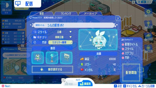 本作は事務所にさまざまな家具や機材を配置することで、シルのステータスを育成できます。ステータスが上がるにつれて、配信の結果が良くなり、獲得できる報酬も多くなります。