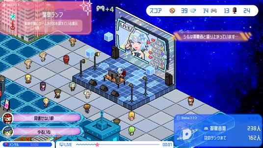 主人公シルのステータスを育て、配信活動を行い、ファンを増やすことで電脳セカイが発展していきます。