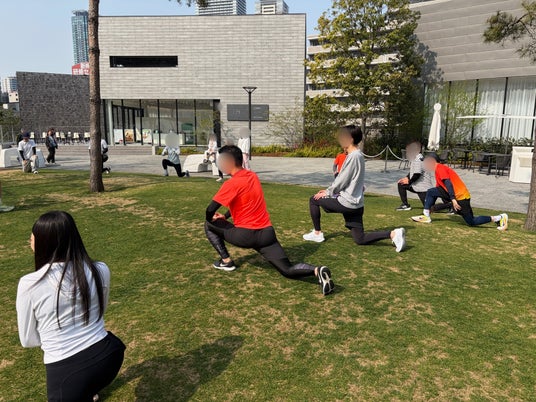 大阪福島ジムReTry_グラングリーン大阪で開催されたランニングイベント_準備運動としてストレッチしている様子