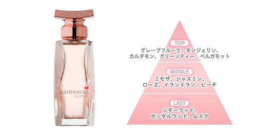 サムライウーマン オードトワレベルガモットやグリーンティー、カルダモンの爽やかな香りに、グレープフルーツやタンジェリンが重なり、ジャスミンやローズ、ピーチのやさしい香りへと変化する、フローラル フルーティーノート。