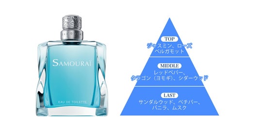 サムライ オードトワレジャスミン、ローズのさわやかで清潔感ある香りから、心地よい安定した香りを持続させながら、魅惑的な東洋の美しい香りになる、フレッシュ アロマテックノート。