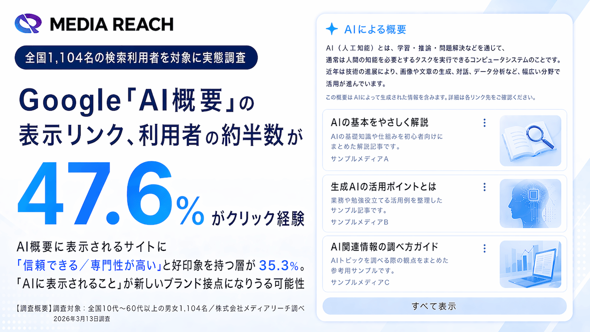 Google「AI概要」の表示リンク、約半数(47.6%)がクリック経験有り【全国1,104名対象/株式会社メディアリーチ調査】 -