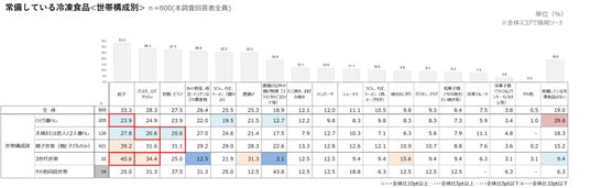 常備している冷凍食品を世帯構成別(n=800)でみると、直近3カ月以内に冷凍食品を購入したことがある世帯のうち、冷凍食品の常備率が最も高いのは【3世代世帯】で、9割を超えた。