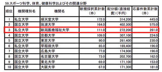 NSGグループの新潟医療福祉大学(以下、本学)は、2026年3月27日に文部科学省から公表された令和7年度科学研究費(以下、科研費)において、「スポーツ科学、体育、健康科学およびその関連分野」の新規採択累計数で全国第3位にランクインしました(下表詳細)。
