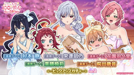 ポッピンゲームズジャパン株式会社は、TVアニメ『君のことが大大大大大好きな100人の彼女』(以下、『100カノ』)初のスマートフォン向けゲームアプリ『君のことが大大大大大好きな100人の彼女 ビビーン!!とパズル』(以下、『100パズ』)で、2026年4月17日(金)より、「【温泉デート】好本 静&栄逢凪乃&花園羽々里ピックアップガチャ」「【温泉デート】院田唐音&薬膳楠莉ピックアップガチャ」を開催しました。ピックアップガチャでは、温泉デート衣装のキャラクターが登場します。
