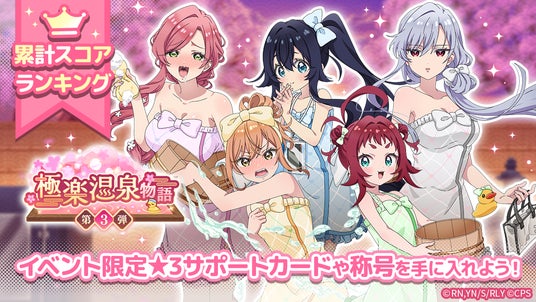 4月18日(土)よりイベント「極楽温泉物語 第3弾」を開催いたします。当イベントでは、イベントマップで集めたポイントで、ピックアップガチャチケットやイベント限定の★3サポートカードが獲得できるポイントガチャも登場します。繰り返し挑戦して報酬を手に入れよう!