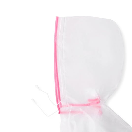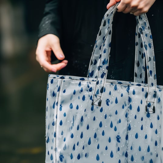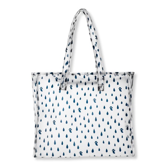 雨の日のおでかけには、ビニール素材のバッグが活躍します。高さ約30.5cm、横約35cm、幅約13cmの大容量サイズで、上部はジッパー付き。濡れずに安心して持ち運べます。