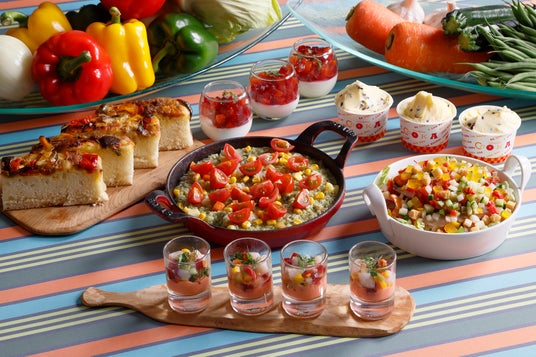 緑黄色野菜とチキンのリゾット ジェノベーゼ風味 / 鶏ハムと緑黄色野菜をつかったアグロピカンテのサラダ / 人参ムースと海老のマチェドニア / グリルベジタブルのフォカッチャ / 緑黄色野菜のジュレとアーモンドミルクプリン / とうもろこしとチョコレートのジェラート