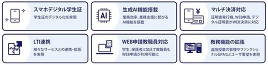 「GAKUEN」シリーズでは、自社アセットで蓄積されるデータ資産を活用し、入学から卒業まで、大学業務および学生生活に関わるさまざまな課題解決を支援します。今回の「GAKUEN RX2.0」第2弾リリースでは、「スマホデジタル学生証」や「マルチ決済対応(学内決済のデジタル化)」などの機能追加により、学生の利便性向上や職員の業務負担軽減といった個別課題の解決に貢献すると同時に、学内業務プロセスの見直しや、データに基づく意思決定を可能にする“実効性のあるDX”の実現に貢献してまいります。
