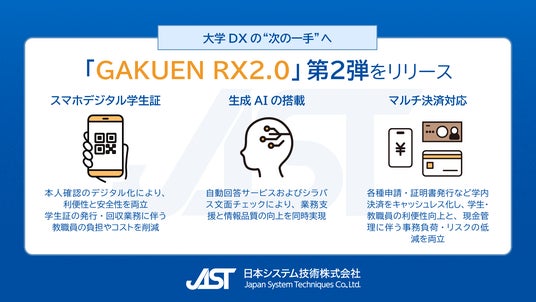 日本システム技術株式会社(本社:大阪市北区、代表取締役社長:平林 卓、以下「JAST」)は、大学向け教務システムとしてトップシェア(※1)を誇る戦略的大学経営システム「GAKUEN」シリーズの最新製品「GAKUEN RX2.0」において、機能強化を行う第2弾リリースを2026年3月31日に実施したことをお知らせいたします。