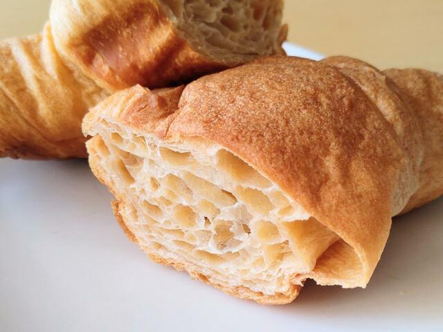 生地はパリパリ系ではなく、しっとり感のある柔らかい食感です。クロワッサンとしてはやや物足りないと感じるかもしれませんが、小麦の風味と程よい甘さを味わえるのは特筆すべき点。