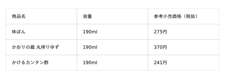 株式会社Mizkan(本社:愛知県半田市、代表取締役社長兼 CEO:槇亮次、以下ミツカン)は、「味ぽん(R)」「かおりの蔵(R) 丸搾りゆず」「かけるカンタン酢(TM)」の190ml容器について、新容器へリニューアルいたします。お客様の声を活かし、容量はそのままにコンパクトで収納しやすく、さらに使いやすい商品としてご提供いたします。