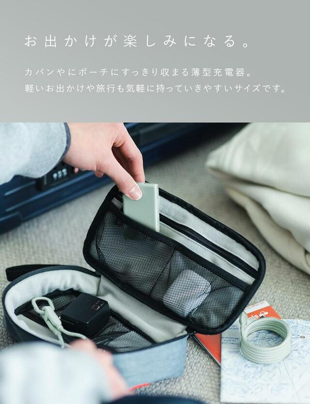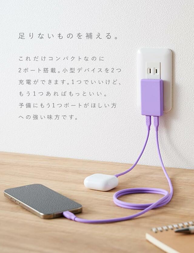コンパクトながら、USB-Cポートを2基搭載している点も見逃せません。スマートフォンやワイヤレスイヤホンなどを2台同時に充電できるため、出張や旅行時の荷物も減らせます。