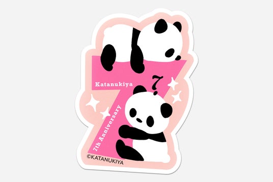 3.お店でもらえる!ありがとうステッカーカタヌキヤが7周年を迎える4月18日(土)より、直営店店頭でカタヌキヤ商品をご購入いただいたお客様へ、先着でお渡しします。「7」にふたごのパンダがぎゅっと抱きついた、7周年記念アートのステッカーです。