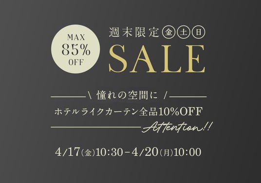 開催期間:4/17 (金)10:30~4/20(月)10:00内容:最大85%OFF、ホテルライクカーテン10%OFF、新商品10%OFF
