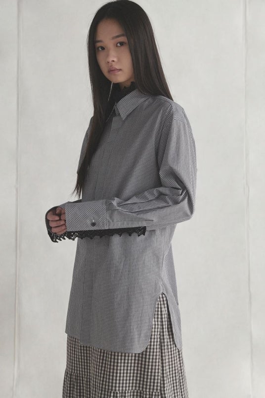 直線的なシルエットにレースで控えめな甘さを添えたギンガムチェックのブラウスや、 異なるチェック柄を組み合わせたボリュームのあるスカート。
