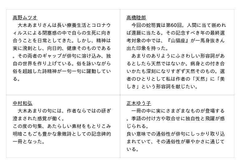【選考委員】 高野ムツオ 高橋睦郎 中村和弘 正木ゆう子 (敬称略/50音順)