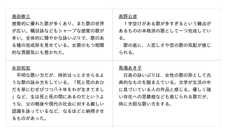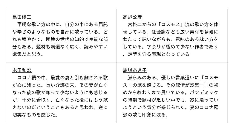 【選考委員】 島田修三 高野公彦 永田和宏 馬場あき子 (敬称略/50音順)
