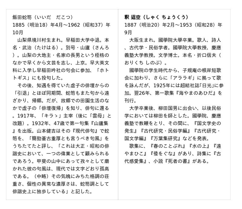 今年2026年に第60回を迎える蛇笏賞・迢空賞は、それぞれ俳人・飯田蛇笏、歌人・釈迢空両氏の遺徳を敬慕して設立されました。俳句・短歌界において、その年の最高の業績を示した句集・歌集に贈られます。